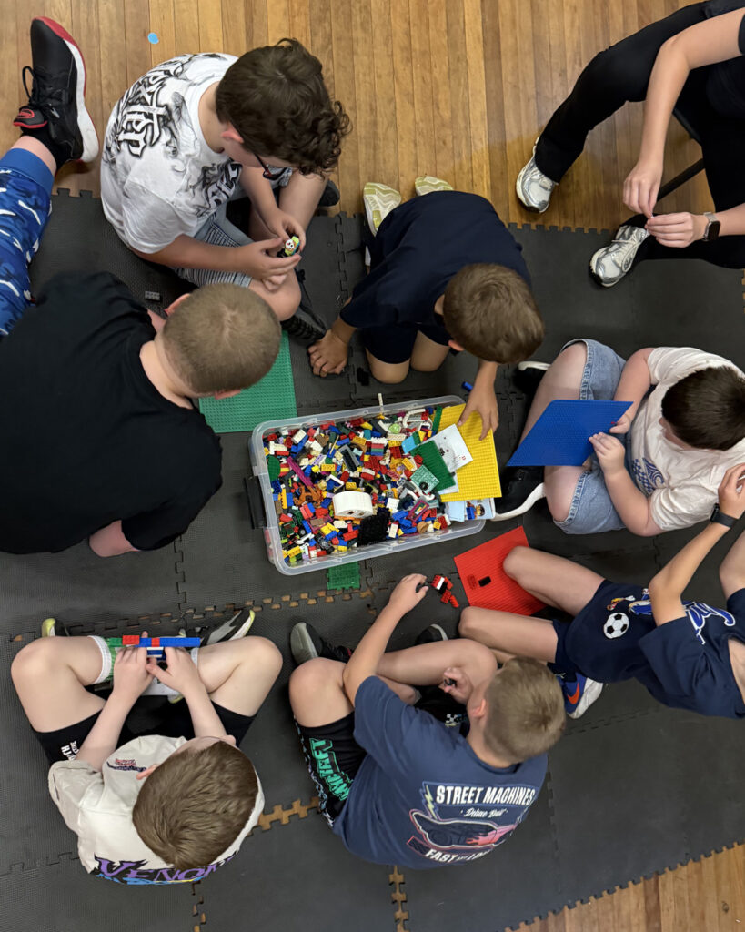 We also had fun with free build time where the boys were able to create anything they wanted and foster some natural social interaction. Obstacle courses, scooter board relays and the air mat gave the boys lots of opportunities to move their bodies before and after sitting at the table building, while working on core strength, arm and shoulder strength which are all necessary for fine motor skill development in putting Lego together. The air mat was lots of fun and requested every session! We can’t wait to see what the next build might be for these creative masters!